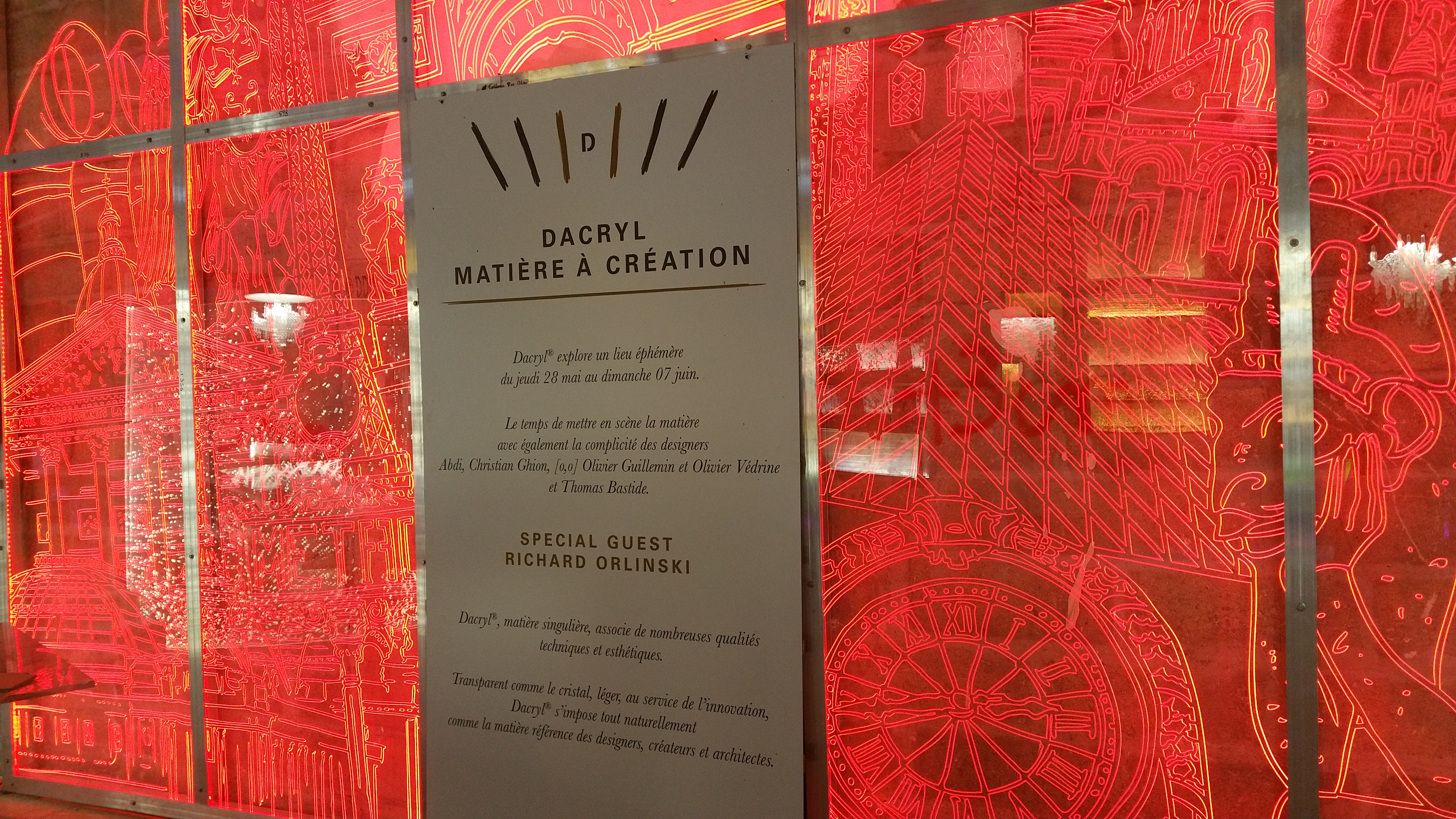 Qu’est ce que le dacryl ? « C’est un verre de synthèse, un acrylique de haut poids moléculaire coulé, aussi transparent que le cristal, 10 fois plus résistant que le verre, 2 fois plus léger que le verre, de très bonne tenue en extérieur, excellent conducteur de lumière, bonnes caractéristiques phoniques, non toxique, recyclable. »